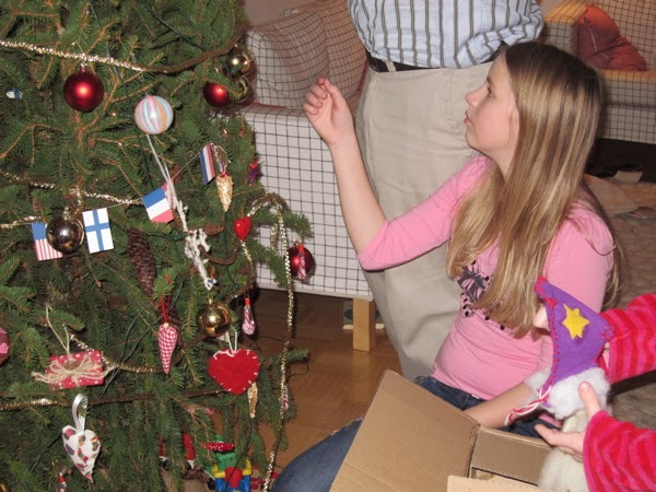 Vi klädde just julgranen, den blev helt fin till slut. Lite platt, men ingen julgran är perfekt. Vi har haft helt sjukt fula julgranar några år, en hade typ inga grenar i mitten, och en såg ut som en boll. Om man jämför med dem är den här granen helt perfekt. Pappa tyckte att vi skulle ha en snygg gran, så alla grejer som vi har gjort i dagis fick hänga upp sej i ett annat träd. Nice try, det fungerade inte. Julgranen har lika mycket fula grejer som jag och Carolina gjorde i dagis för tio år sedan som alltid. Plus att den där stackars benjaminfikusen är full med grejer som mina två andra systrar har gjort.